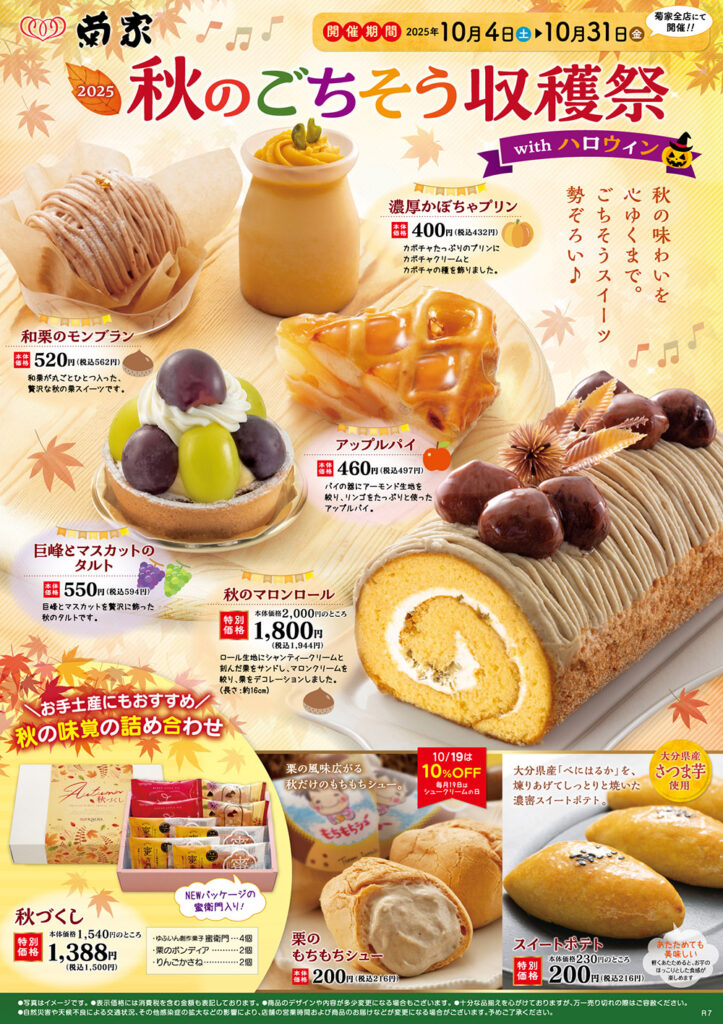 【予告】2025秋のごちそう収穫祭withハロウィン 投稿日 2025年10月1日 著者 kikuya カテゴリー イベント カテゴリー お知らせ 【予告】2025秋のごちそう収穫祭withハロウィン 秋の実りがひときわ美味しく感じられる季節…そんな食欲の秋にお届けする、菊家の人気イベント「秋のごちそう収穫祭」を今年も開催いたします! いも・くり・カボチャなど旬の素材を使ったスイーツや、かわいいハロウィンスイーツ、この期間だけのお買い得商品もございます。 10月4日(土)からスタートです!ぜひお近くの菊家のお店でチェックしてみてくださいね(^〇^)/