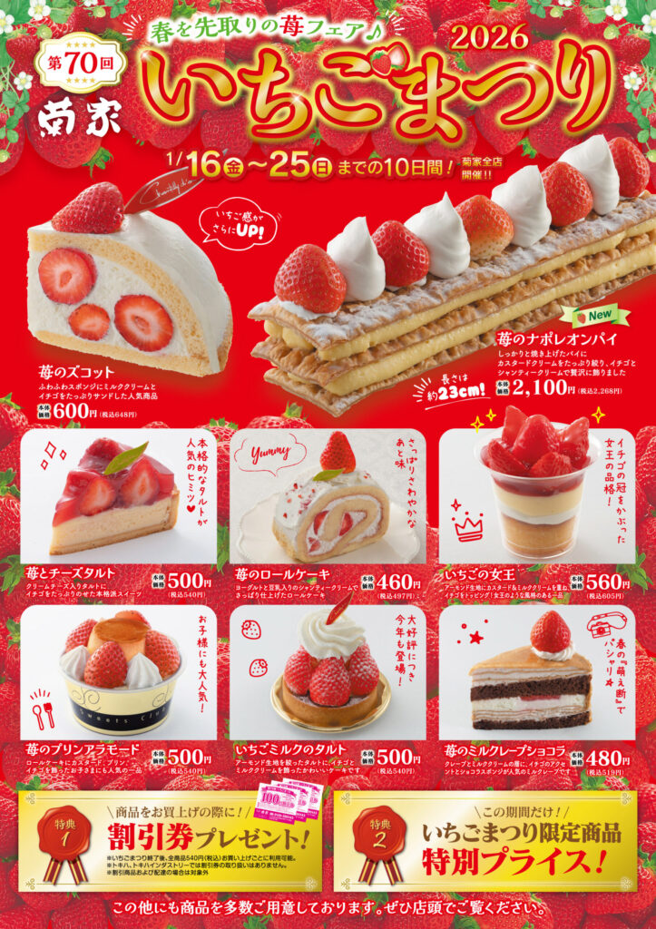 1月16日(金)~25日(日)まで、お菓子の菊家恒例の大人気イベント「いちごまつり」が開催されます!
