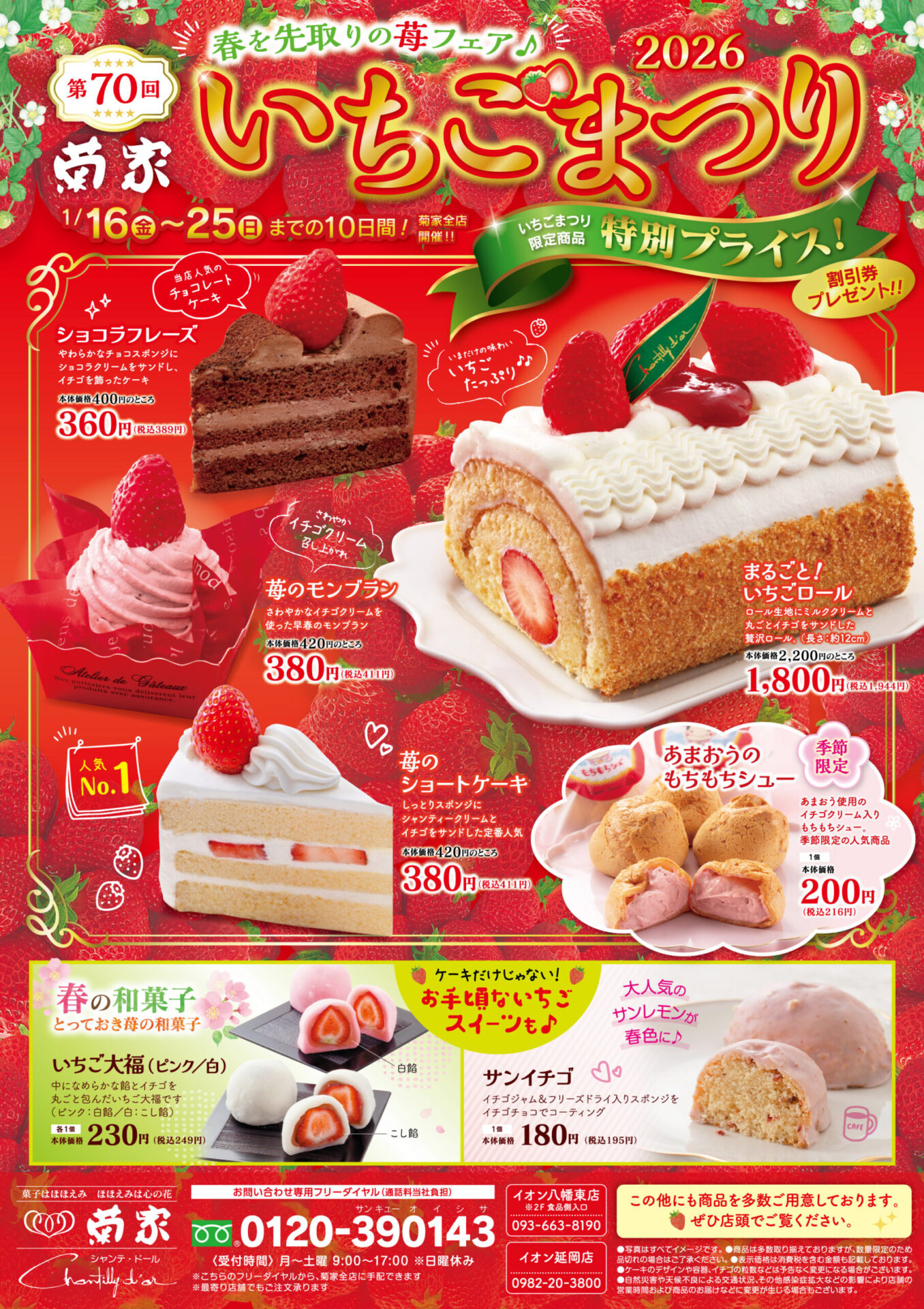 🍓いちごまつり2026開催🍓 投稿日 2026年1月15日 更新日 2026年3月6日 著者 kikuya カテゴリー イベント 🍓いちごまつり2026開催🍓 1月16日(金)~25日(日)まで、お菓子の菊家恒例の大人気イベント「いちごまつり」が開催されます!毎年人気の商品に加え、いちごまつり期間だけの特別商品も登場します。期間中は「特別プライス商品」や「割引券のプレゼント」など、お得もいっぱい♪ショーケースが真っ赤に彩られる10日間♡お菓子の菊家全店で皆さまをお待ちしています(^O^)/